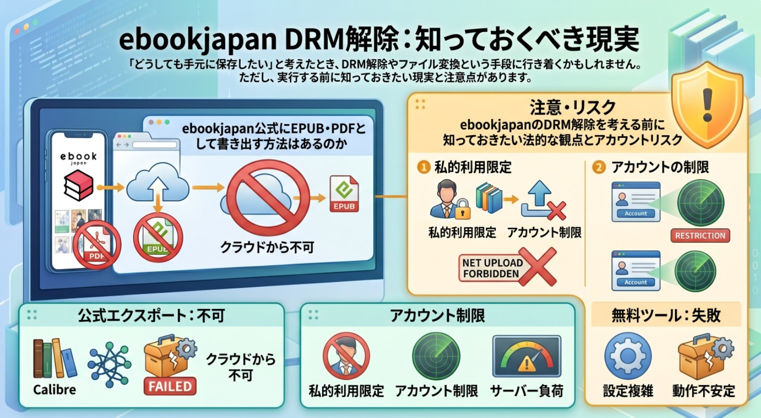 - アカウント停止などのリスク:ebookjapanの利用規約では、システムの解析やDRMの回避に関わる行為が問題視される可能性があります。不審なアクセスや不適切なツールの利用が検知された場合、アカウントに何らかの制限がかかるリスクも否定できません。