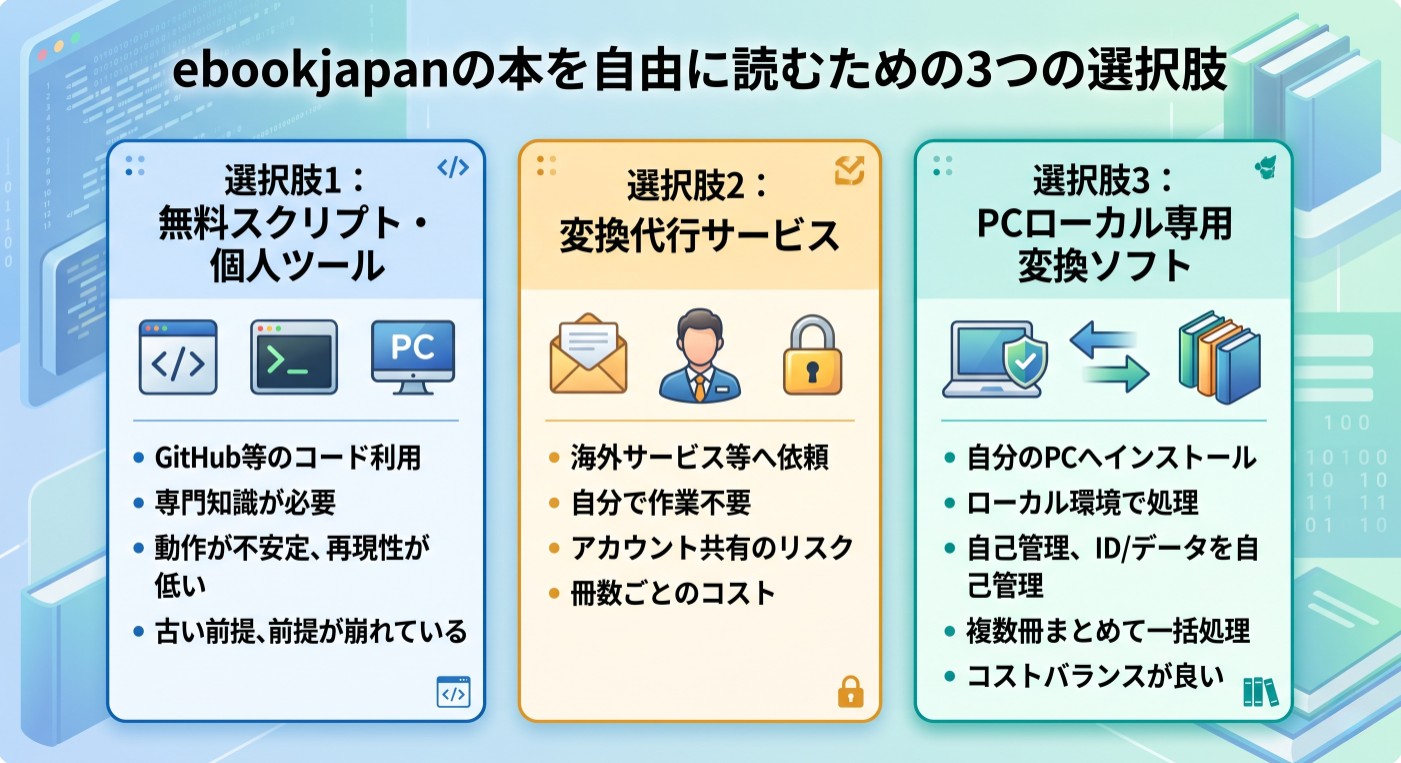 では、安全に蔵書を守りつつ、より自由に本を読むためにはどうすればよいのでしょうか。ebookjapanのDRMに対応しようとする場合、一般的に考えられる方法は大きく3つあります。ここでは「導入のしやすさ」「安定性」「安全性」「継続利用のしやすさ」という観点から、それぞれの現実を整理します。