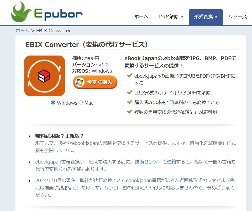 - ebookjapan独自の形式をEPUB・PDF・JPEGなどの汎用形式へ高品質に変換