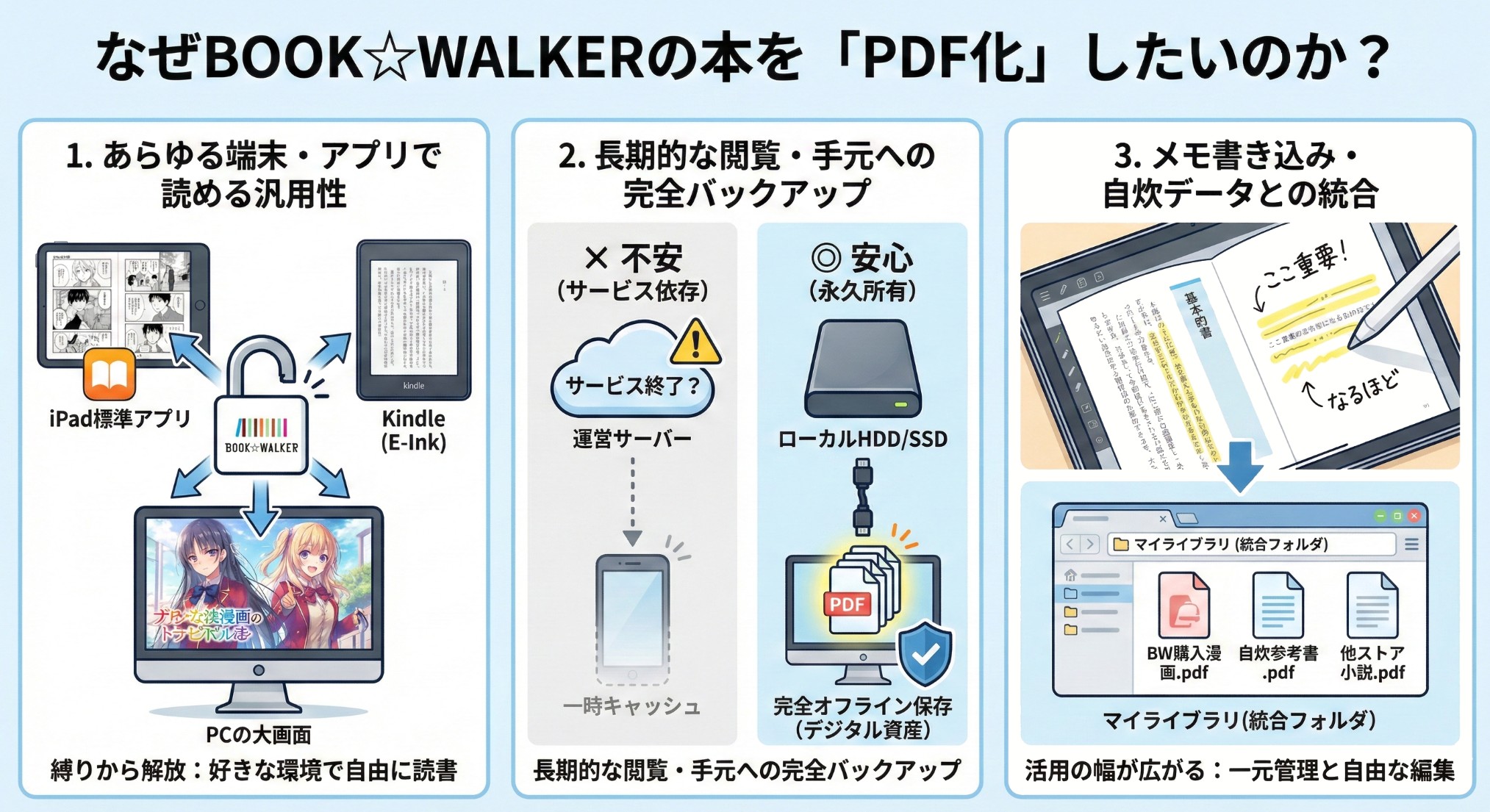 しかし、独立したPDFファイルとしてPCやハードディスクに保存しておけば、ネット環境や公式サーバーの稼働状況に一切依存しない、完全なオフライン保存が可能になります。本当の意味でデジタル資産を「永久所有」できる安心感は計り知れません。