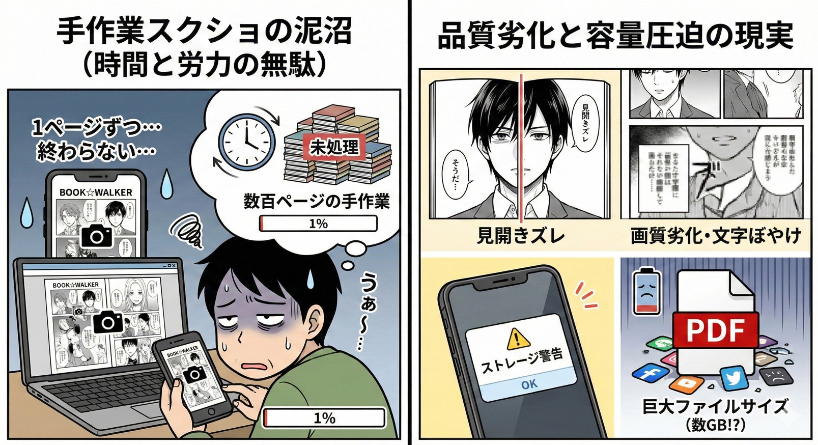 読むときの快適さが下がってしまうことも大きな問題です。スクショを使ってbookwalkerをpdf化しようとすると、パソコンやスマホの画面に合わせて切り取るため、どうしても元のデータより画質が粗くなりがちです。漫画の大切な見開きページがズレてしまったり、小さな文字がぼやけて読みにくくなったりすることも少なくありません。 また、ただの画像データを束ねてPDFを作ると、ファイルのデータサイズがとても大きくなりやすく、スマホやタブレットの空き容量をすぐに圧迫してしまうのも困るポイントです。