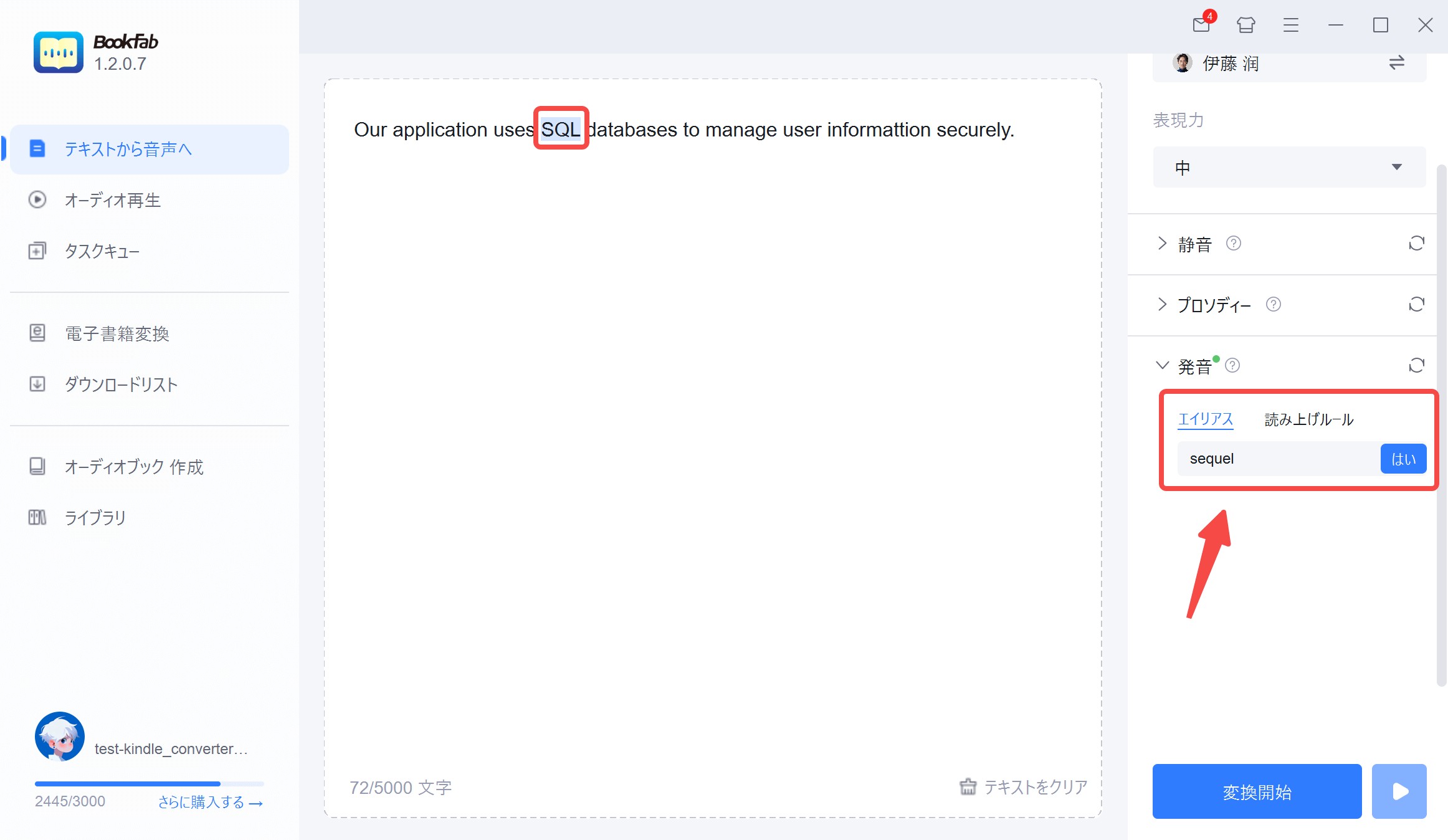 すると、BookFabは「SQL」が現れるたびに標準の発音を上書きして、「sequel」と読み上げます。