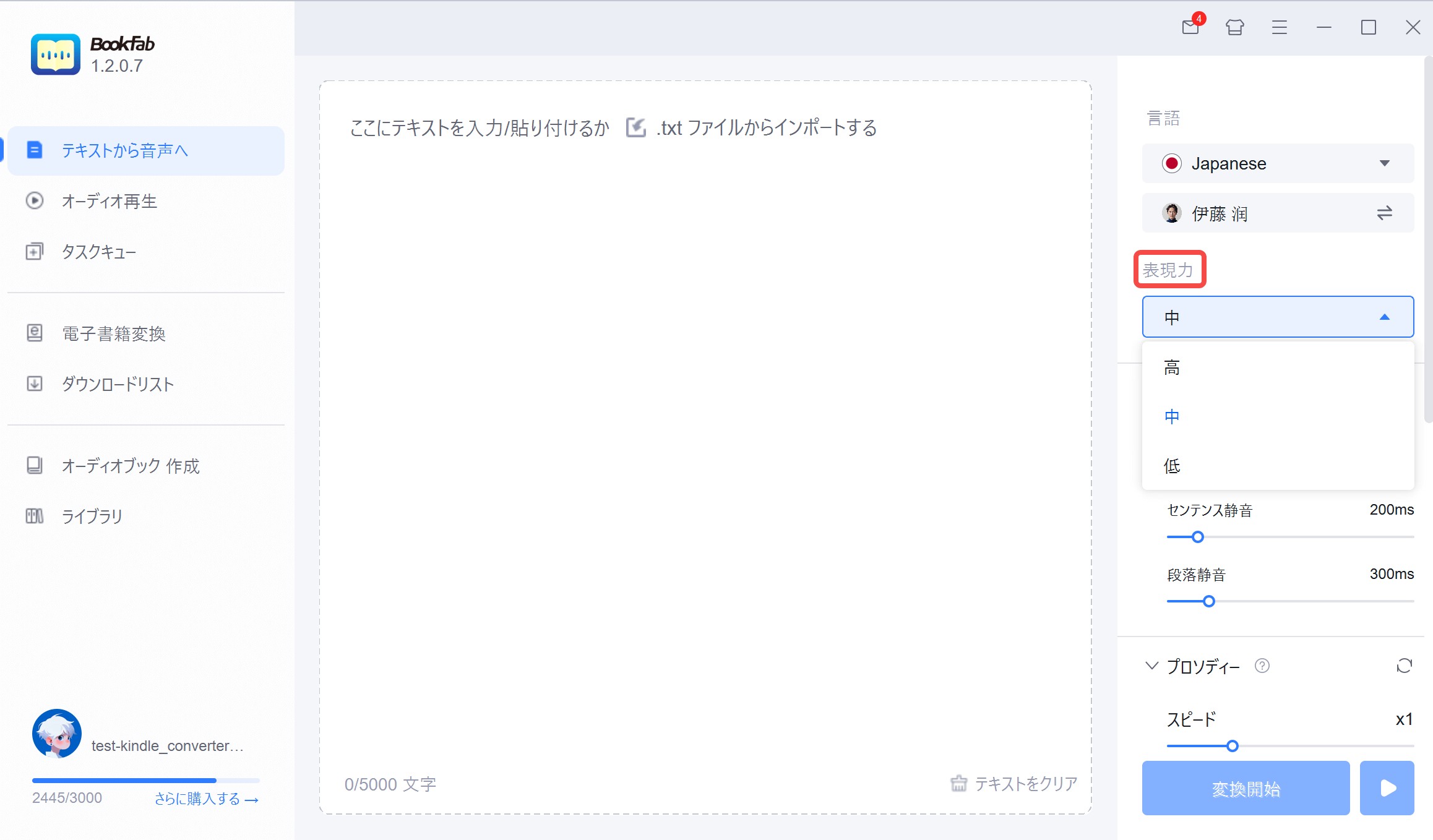 BookFab TTS ではこれらを「低・中・高」の3つのプリセットとして提供しており、ユーザーは top_k、 top_p、temperatureの詳細を気にせずレベルを選ぶだけです。
