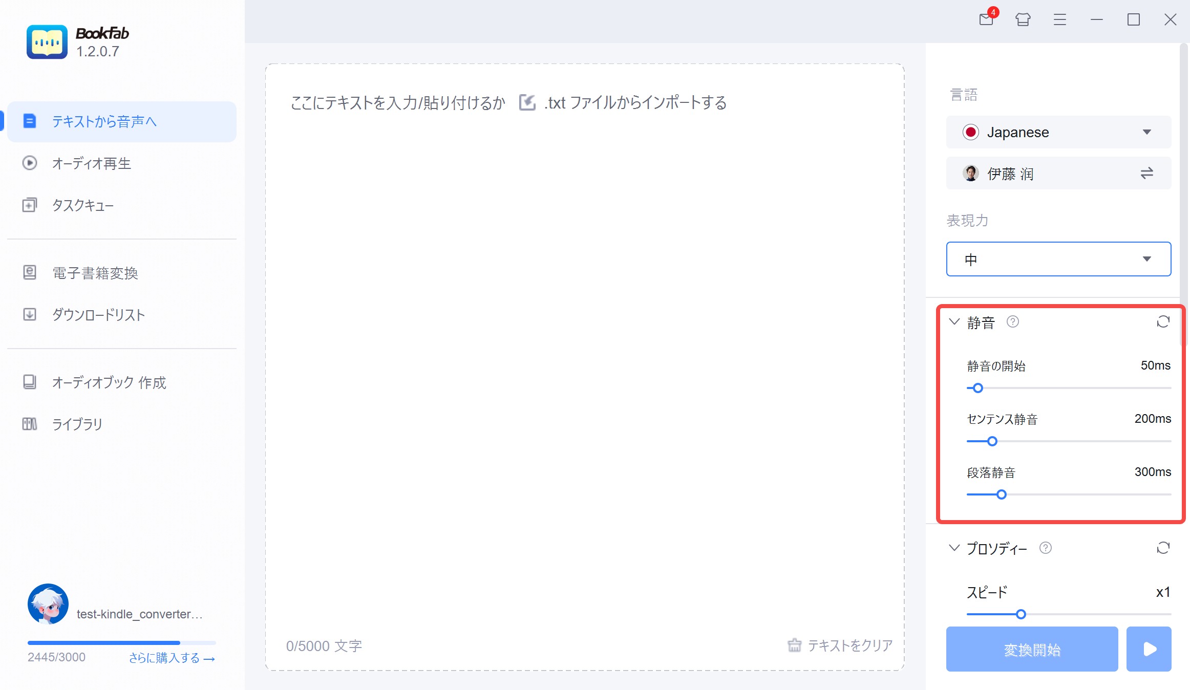 静音の開始は、BookFab TTSが音声を開始する前に追加する無音の長さ(0〜2000ms)を設定します。音声コンテンツを唐突ではなく洗練された印象に仕上げるのに役立ちます。